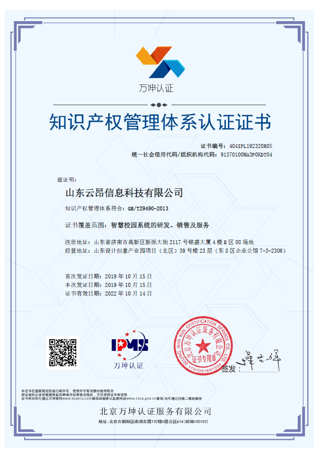 近日,云昂信息通过了知识产权管理体系认证(GB/T29490-2013)。