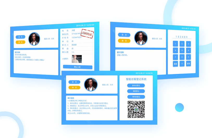智能访客系统,通过打造以人脸识别设备为枢纽的预约、到访、验证、开门的全流程闭环式服务体系,大幅提升用户接待工作效率、服务品质和学校形象,使访客通行更高效、更规范,管理更简洁、更科学。